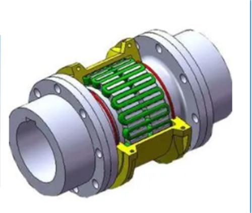 (2)撓性聯(lián)軸器:又分為齒套式和蛇形彈簧式兩種。齒套式聯(lián)軸器用套微的內(nèi)齒分別與兩個齒輪嚙合,使兩個轉(zhuǎn)子聯(lián)接起來。它的優(yōu)點是有一定的活動性,可以消除和減弱振動的傳遞,對轉(zhuǎn)子中心要求不很高,不傳遞軸位移,但必須在運轉(zhuǎn)時通入潤滑劑,檢修和安裝要求質(zhì)量高。蛇形彈簧管聯(lián)軸器是在兩個被連接的對輪的外緣銑出的類似漸開線的牙齒上,沿園周嵌入若干彈性剛帶制成的蛇形彈簧,把兩個對輪聯(lián)接起來。優(yōu)點是:能避免傳遞振動,又允許轉(zhuǎn)子有較大的中心偏差和軸向位移。但結(jié)構復雜、傳遞力矩小,運行中需要潤滑。